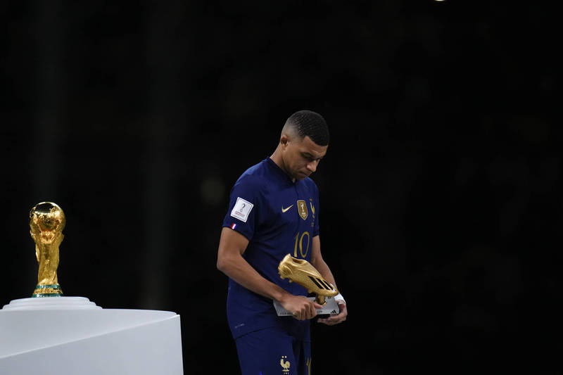 姆巴佩賽後獲頒金靴獎,表情落寞。(美聯社)