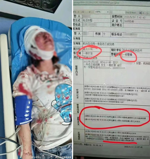左圖:被打傷的其中一名女子。 右圖:唐山警方接到民衆報警的記錄。(網絡截圖)