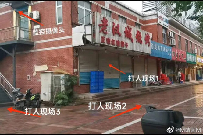 发生恶性打人事件的唐山烧烤店,网友图解三段打人视频现场地点。( 微博)