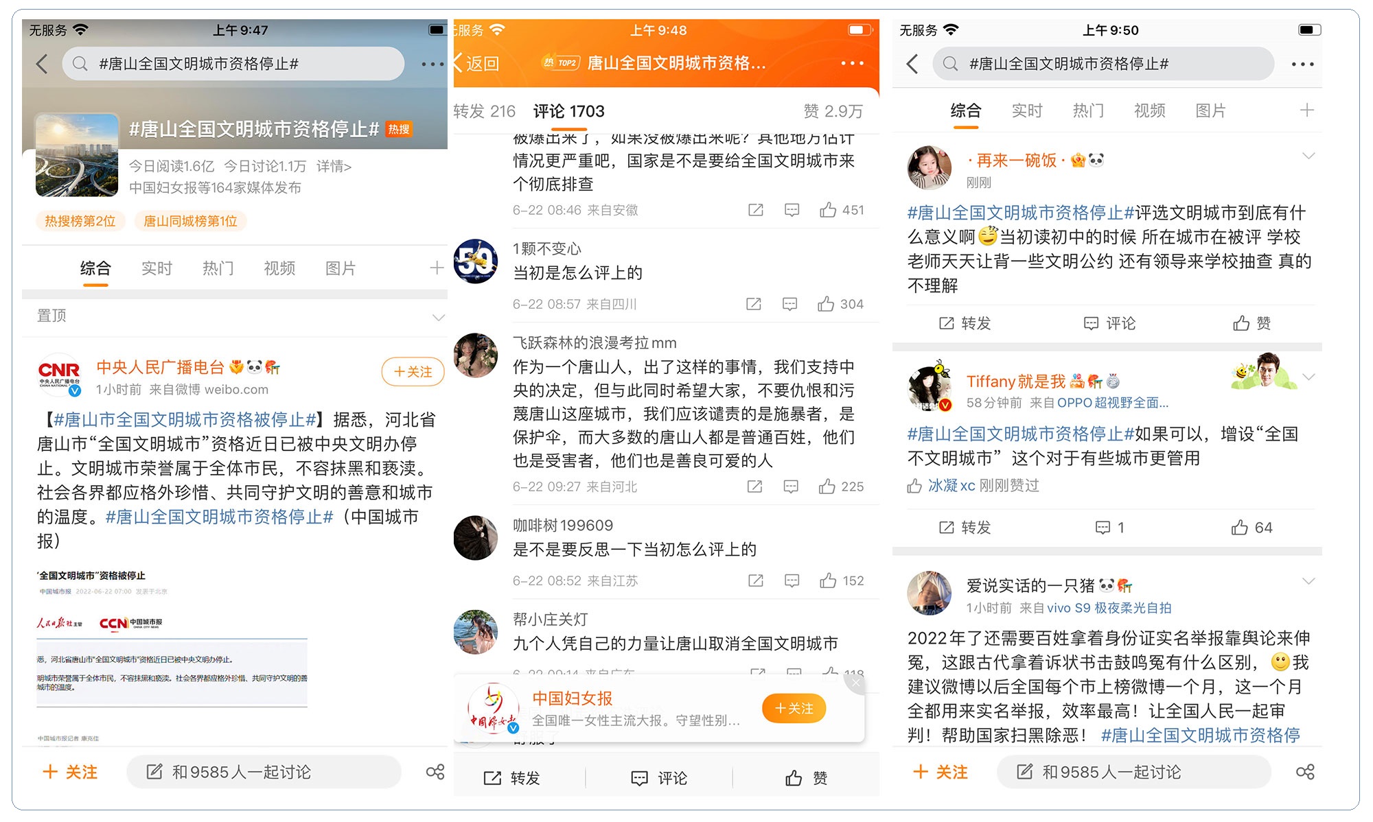 近日中共中央文明辦已停止唐山“全國文明城市”資格,當局強調,文明城市榮譽屬於全體市民,不容抹黑和褻瀆。社會各界都應格外珍惜、共同守護文明的善意和城市的溫度”。消息一出,中國各地媒體紛紛轉載。中央人民廣播電臺新浪微博發出相關報道後,在一個小時內,點擊量達1.6億次,並登上熱搜第二,數小時後,相關消息登上熱搜榜首。截止中午時分,唐山被停止“全國文明城市”資格的點擊量再翻一倍,達三億多次。有網民留言寫道,九個人憑自己的力量,讓唐山取消全國文明城市。有網民建議增設全國不文明城市,將唐山納入其中。