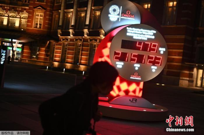 资料图:当地时间3月30日晚,东京奥组委宣布东京奥运会、残奥会分别将于2021年7月23日和8月24日开幕。图为东京街头的奥运会倒计时牌重新启动计时。