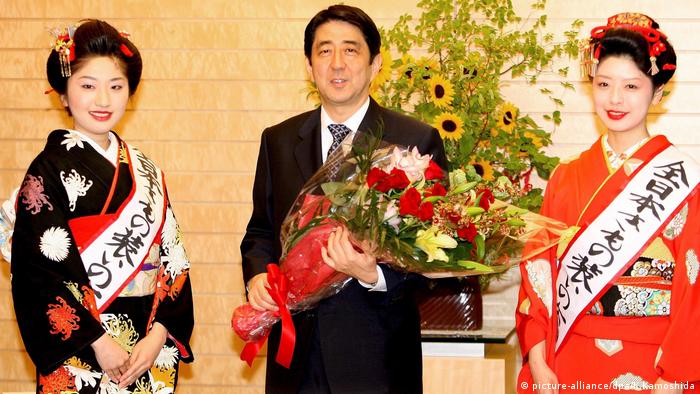 2006年,安倍晉三成為日本戰後最年輕的首相,時年52歲。不過,僅一年後,他便宣佈辭職,理由是潰瘍性結腸炎帶來的頻繁如廁等問題給工作帶來諸多不便。安倍晉三出身於政治世家。圖為2007年安倍晉三任內,和服選美冠軍拜訪首相府。