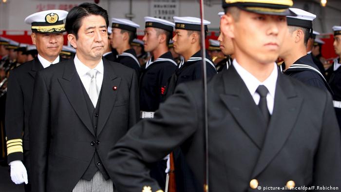 修憲爭議 安倍致力於修改和平憲法。2015年,他推動通過了新安保法,引發國內外爭議。根據該法,日本除直接遭遇武力攻擊時的自衛、還擊外,還將在同盟國遭遇武力攻擊時,可能協助他國動武。圖為2006年安倍視察海軍自衛隊。