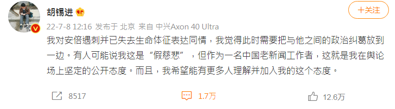 胡錫進指,他對安倍晉三遇刺一事表達同情,「我覺得此時需要把與他之間的政治糾葛放到一邊」。中國小粉紅是非不辨成性,胡錫進表示,可能有人覺得他「假慈悲」,但身為一名中國資深新聞工作者,「這就是我在輿論場上堅定的公開態度」,並強調「希望能有更多人理解並加入我的這個態度」。​