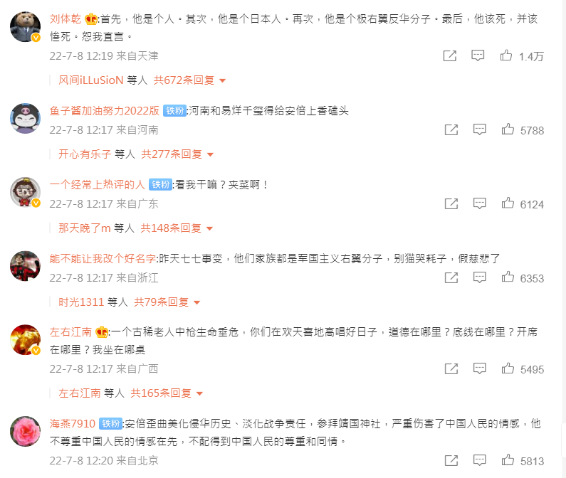 對此,有少數正常中國網友留言響應胡錫進,「這次是真的挺老胡」,但更多是小粉紅的冷嘲熱諷,「一個古稀老人中槍生命垂危,你們在歡天喜地高唱好日子,道德在哪裡?底線在哪裡?開席在哪裡?我坐在哪桌」、「首先,他是個人。其次,他是個日本人。再次,他是個極右翼反華分子。最後,他該死,並該慘死。恕我直言」,還有小粉紅嗆胡錫進「忘了自己是中國人」。