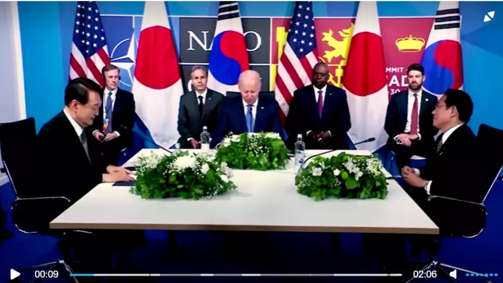 於6月29日在北約馬德里峰會期間舉行三方首腦會談,就加強合作應對朝鮮核導威脅達成共識。