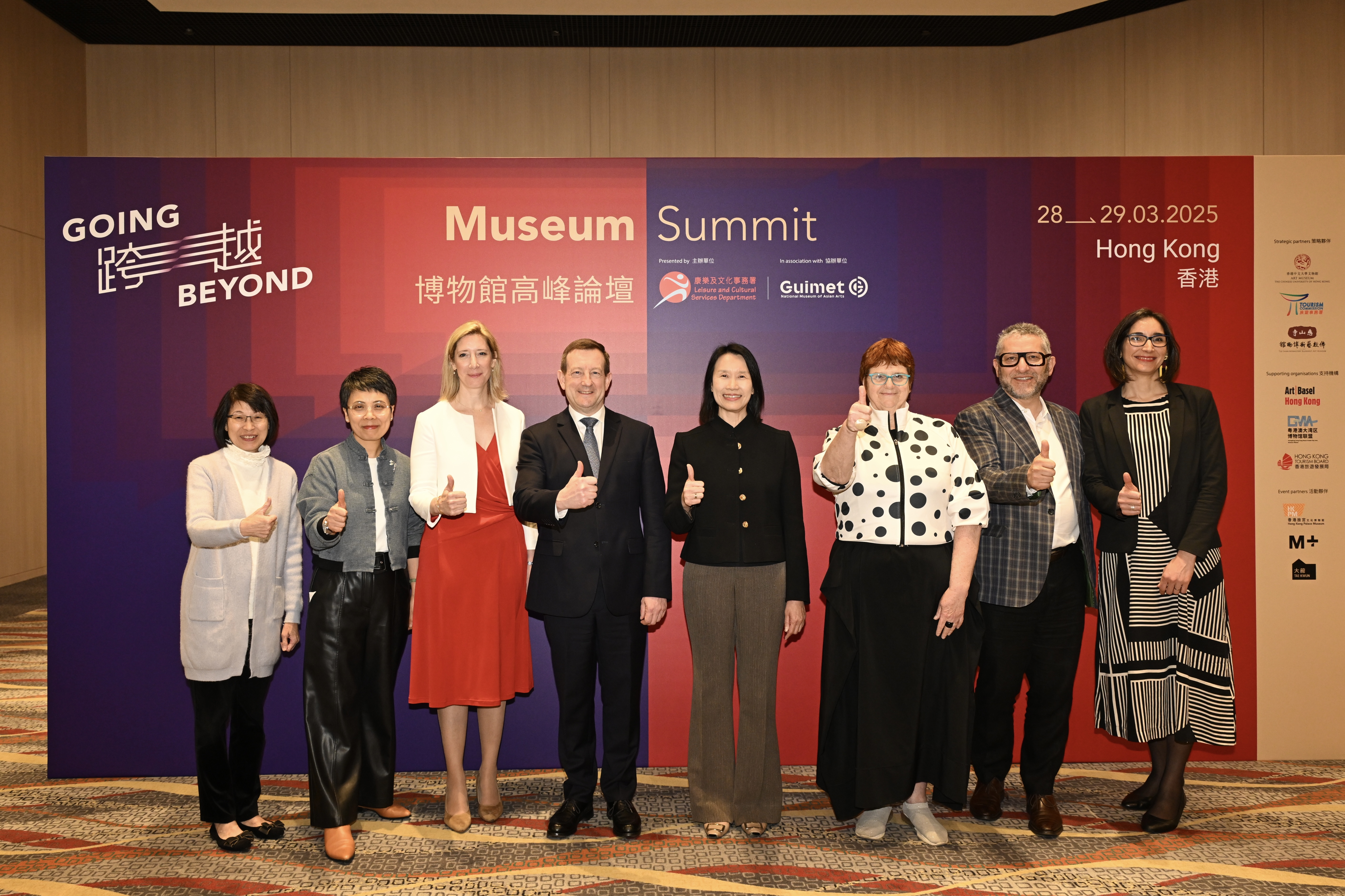 由康樂及文化事務署(康文署)主辦、法國吉美國立亞洲藝術博物館協辦的「博物館高峰論壇2025」今日(三月二十九日)圓滿結束。圖示(左起)康文署助理署長(文博)梁潔玲、康文署副署長(文化)譚美兒、法國駐港澳總領事杜麗緹、法國駐華大使白玉堂、康文署署長陳詠雯、法國吉美國立亞洲藝術博物館(博物館)主席Yannick Lintz博士、博物館首席館員Jamel Oubechou,以及博物館節目及觀眾事務總監Anne Yanover。