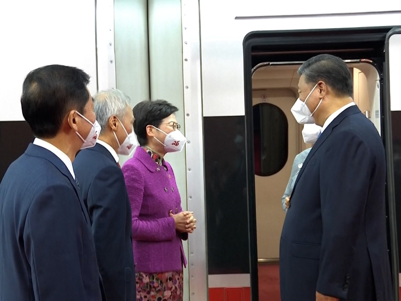 習近平與夫人彭麗媛以及中央辦公廳主任丁薛祥、中央軍委副主席許其亮、全國人大副委員長沈躍躍、國務委員兼外長王毅、全國政協副主席兼國務院港澳辦主任夏寶龍等5名隨行領導人,在高鐵西九龍站乘坐專列返回內地。