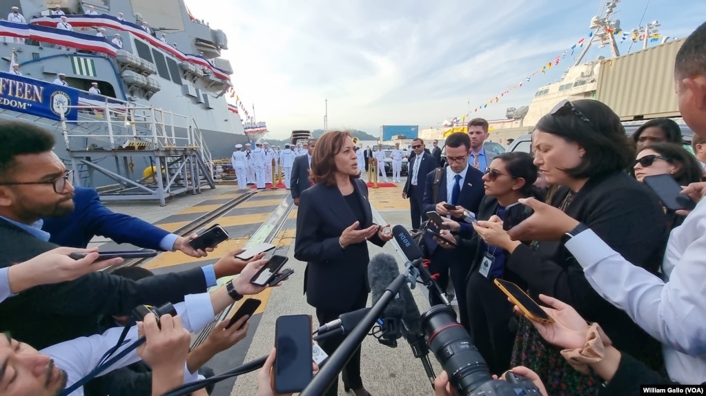 美國副總統哈里斯週三(9月28日)在日本東京附近的橫須賀美國海軍基地停靠的美國霍華德號驅逐艦上與媒體交談。