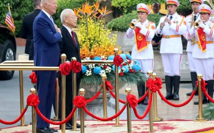 美國總統喬拜登在結束對河內的訪問時提到了越南戰爭(1955-1975 年)。競選連任下屆總統(2024年)的喬-拜登去了1967年10月26日約翰-麥凱恩的飛機被擊落的地方向紀念碑獻花環致敬。麥凱恩當年作為戰鬥機飛行員身負重傷,被俘虜後關押了五年多,並遭受了酷刑。
