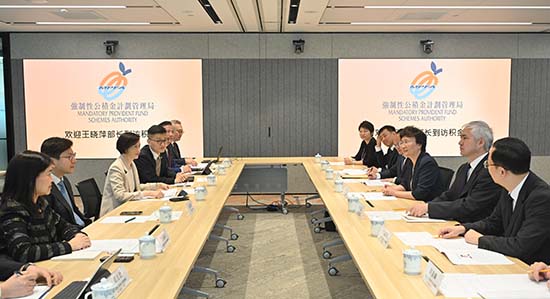 人力資源和社會保障部部長王曉萍昨日(五月六日)考察強制性公積金計劃管理局(積金局)和勞工處建造業招聘中心,分別了解香港退休保障制度和就業服務的最新情況。圖示王曉萍部長(右三)與勞工及福利局局長孫玉菡(左二)和積金局主席劉麥嘉軒(左三)會面。