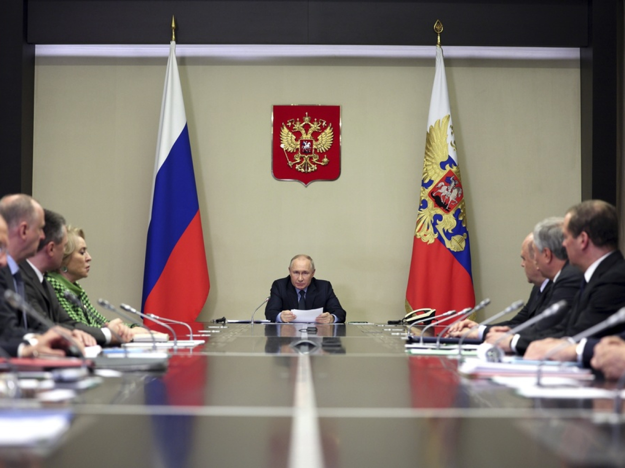 普京與聯邦安全會議成員、政府和安全機構負責人舉行會議,討論中東局勢及俄羅斯安全等問題。(美聯社)