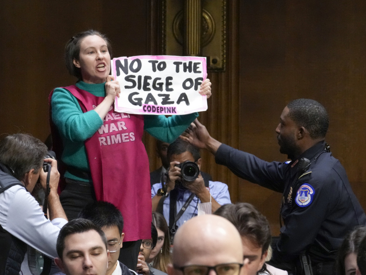 聽證會開始時,一排抗議者高舉染紅的雙手進行反戰抗議。在他們高喊「立即停火!」和「保護加薩的孩子!」等抗議口號後,國會警察將他們帶出了聽證會。