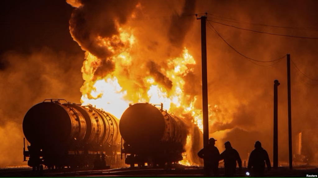 烏克蘭頓內茨克地區的油罐車在俄羅斯的攻擊中起火燃燒。(2023年10月31日路透照片)