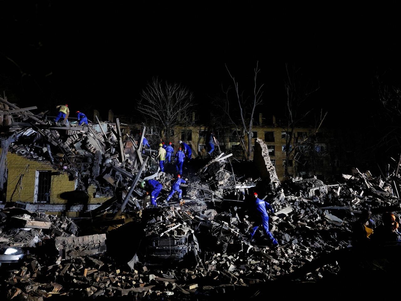 救援人員在烏克蘭頓內茨克地區斯洛維揚斯克鎮的俄羅斯空襲現場工作(路透社)