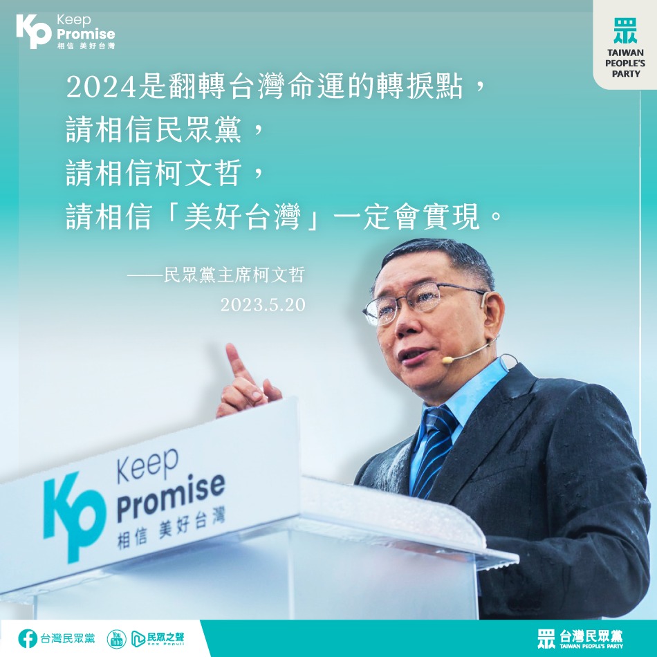 他也說,台灣應該要由清廉、勤政、愛民、愛鄉土的政府來帶領,讓人民迎向光明希望;而不是口號治國、債留子孫、利用意識形態,製造仇恨對立。一起期待更團結的台灣、更清廉的政府、更公平正義的社會、更共融永續的未來,期待並迎接改變,讓2024成為翻轉台灣命運的轉捩點。
