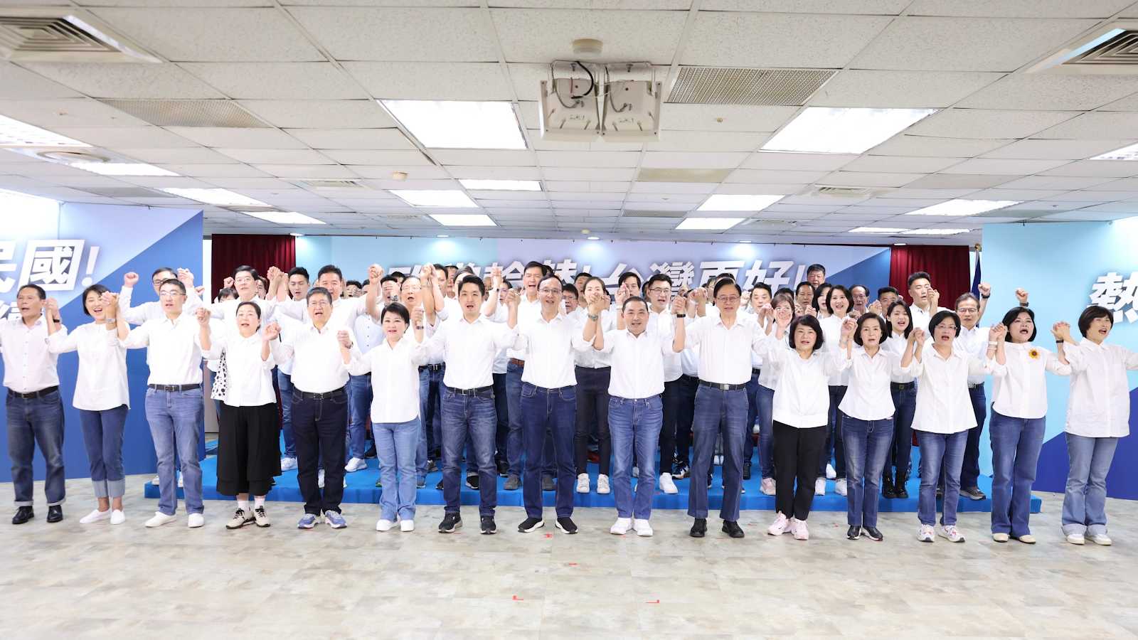 各區國民黨提名之立委候選人也同時舉行造勢,展現總統、立委聯合競選的大團結作戰氣勢,候選人將手放在「勝利翻轉台灣」方塊後,原先各種雜亂顏色的方塊立即變為藍色,象徵政黨輪替、台灣更好,相信必能讓國民黨立委全壘打、總統順利勝選。