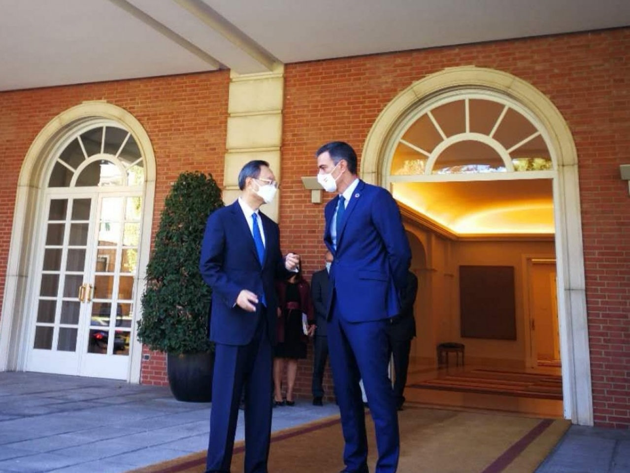 西班牙首相桑切斯在馬德里會見到訪的中共中央政治局委員、中央外事工作委員會辦公室主任楊潔篪。