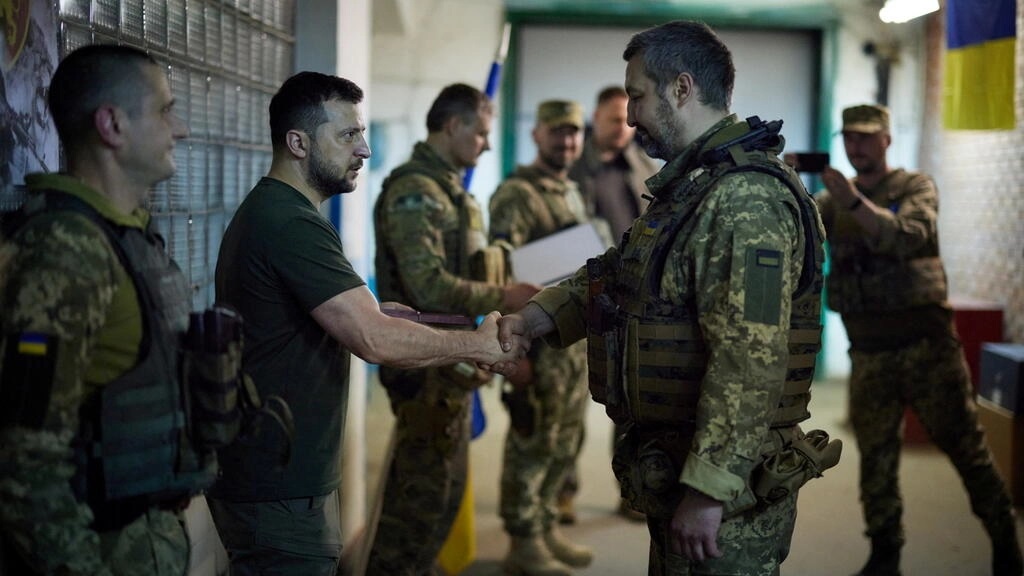 2022年6月5日,烏克蘭總統澤連斯基前往烏克蘭東部頓巴斯的索萊達,並慰問獎勵烏克蘭士兵。 © REUTERS – UKRAINIAN PRESIDENTIAL PRESS SER