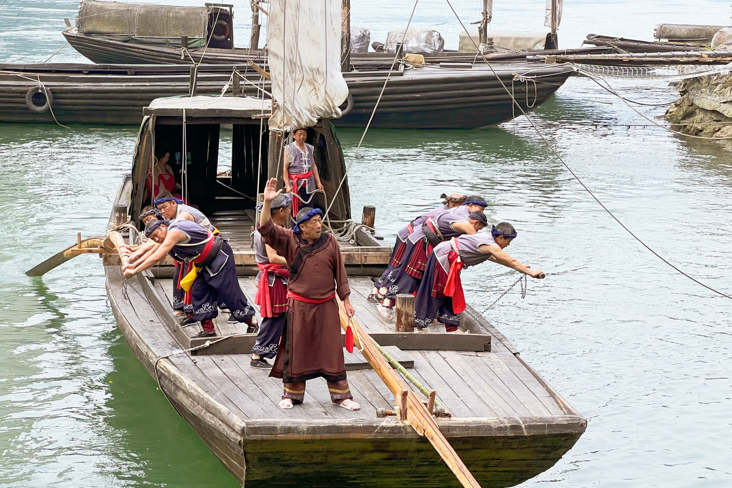 三峽工程興建,高峽平湖代替了激流險灘,機動船舶代替了木舟,峽江號子逐漸成為歷史長河中的“絕唱”。如今,作為文旅融合項目的峽江號子,站在實景山水舞臺上,向人們講述著峽江兒女與激流險灘拼搏的歷史。