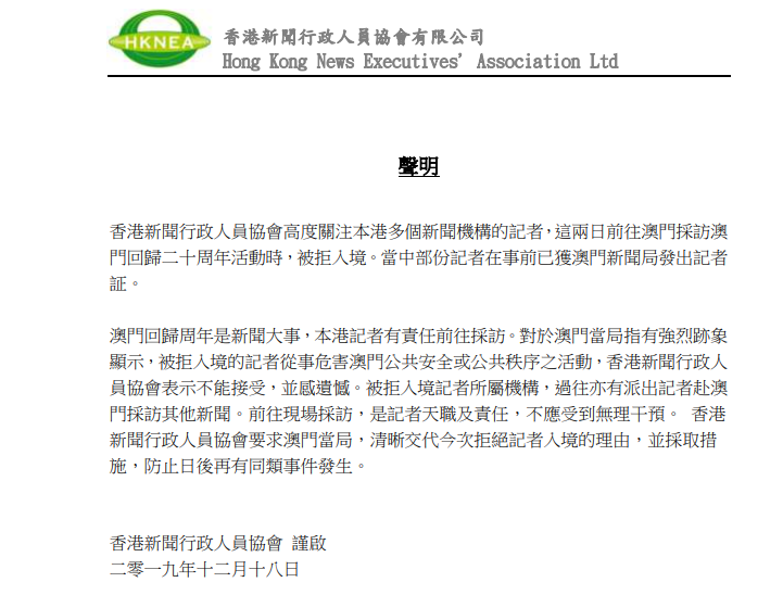 香港记者协会曾就此发表公开信,对澳门拒绝记者入境表示极度遗憾,促请内地及澳门当局基于尊重新闻自由的原则,勿再肆意限制记者的出入境权利。澳门传媒工作者协会早前亦发声明,谴责有澳门记者遭不明身份人士恐吓。