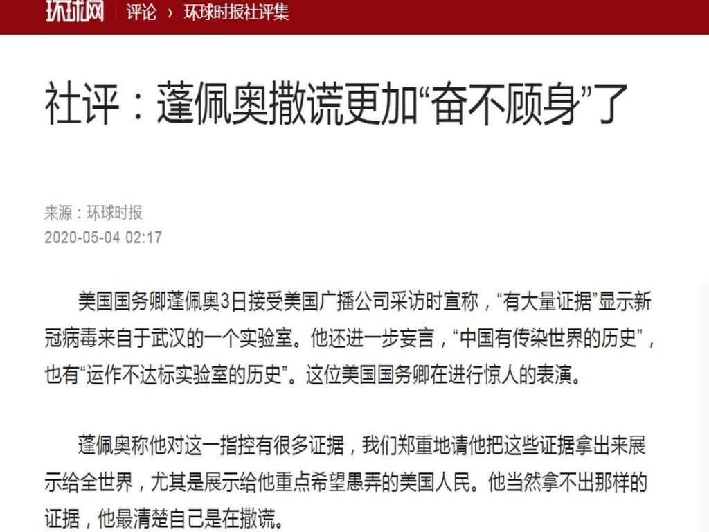 环球时报在回应蓬佩奥周日访谈的一篇社论中称,蓬佩奥称他对这一指控有很多证据,请他把这些证据拿出来展示给全世界,尤其是展示给他重点希望愚弄的美国人民。社论称,美国政府在以罕见的力度发动一场宣传攻势,试图把当前全球抗疫的清晰画面搅乱。