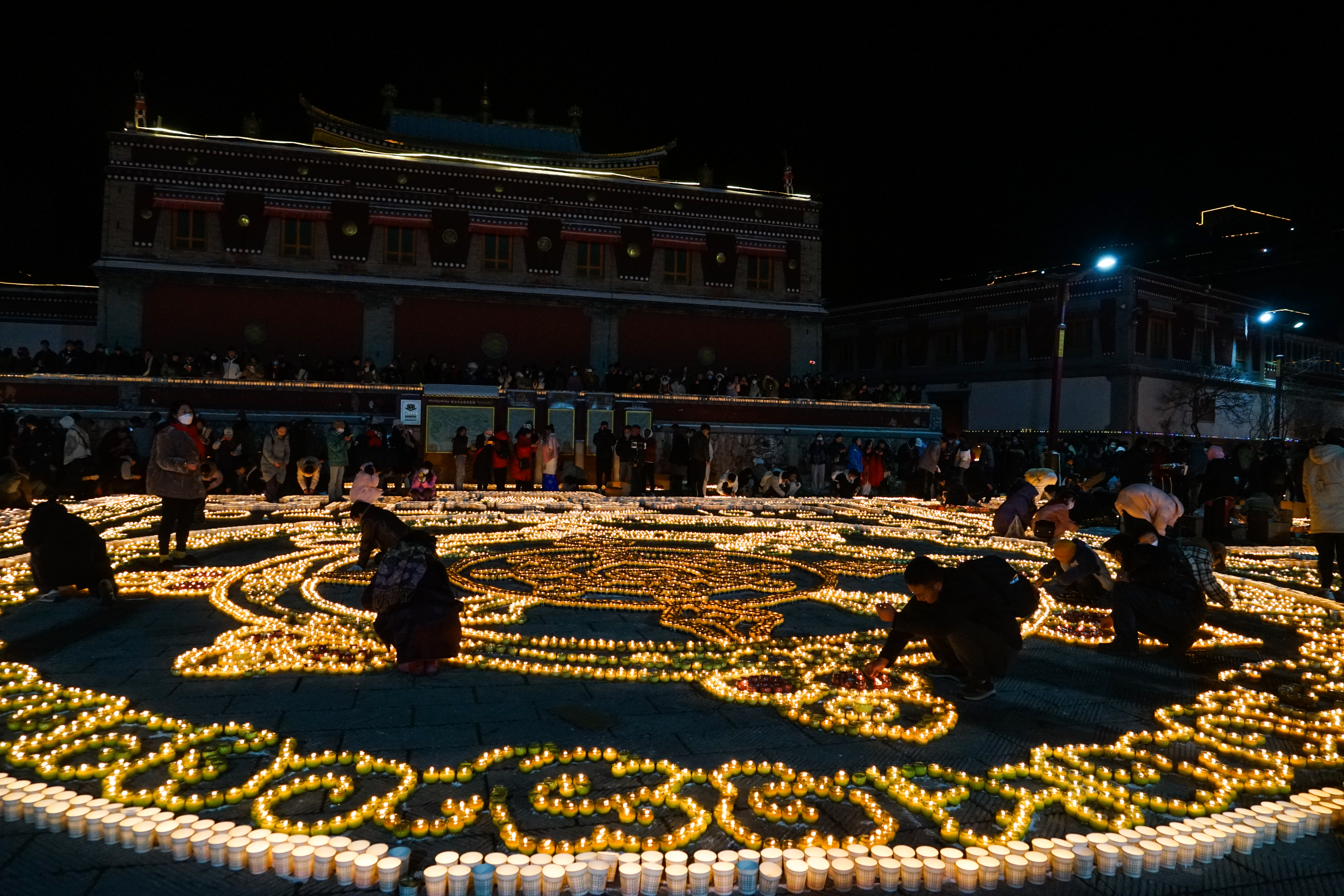 傍晚六時許,在塔爾寺標誌性建築八寶如意塔周圍,僧眾在擺成各種圖案、藏漢字符的燈陣中小心翼翼穿行,用紙板圍擋住搖曳火光,蹲在地上一遍遍重新燃起被風吹熄的點點火苗,口中默誦經文,不少人環顧四周,高舉手機,記錄殊勝時刻。