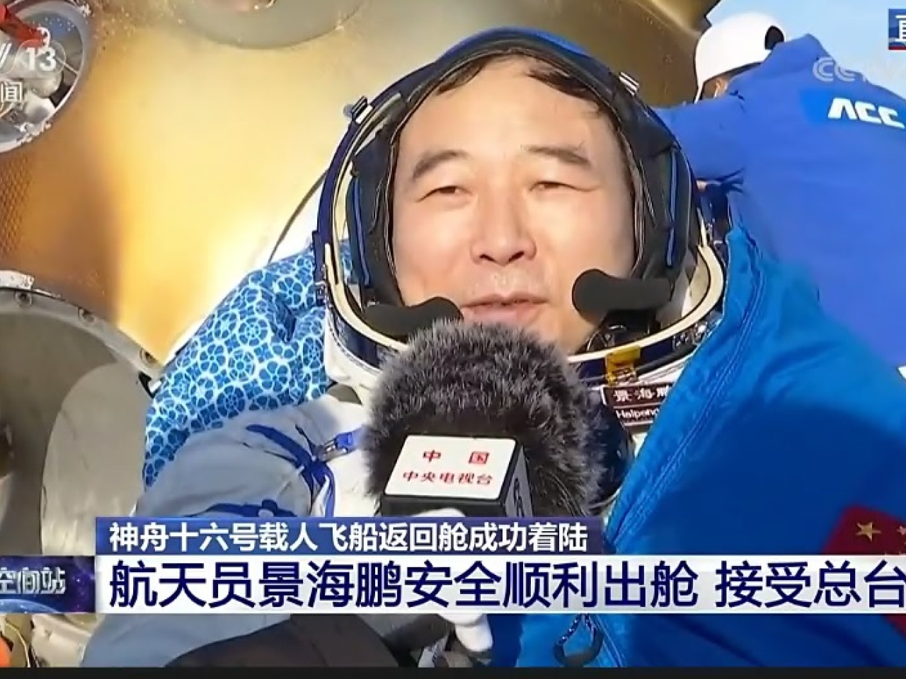 指令長景海鵬首先出艙。他說,終於回家心情激動,讚揚兩位拍擋在太空的表現,形容在太空開心生活,高效工作。他又說,在太空上的操作做到零差錯、零失誤。