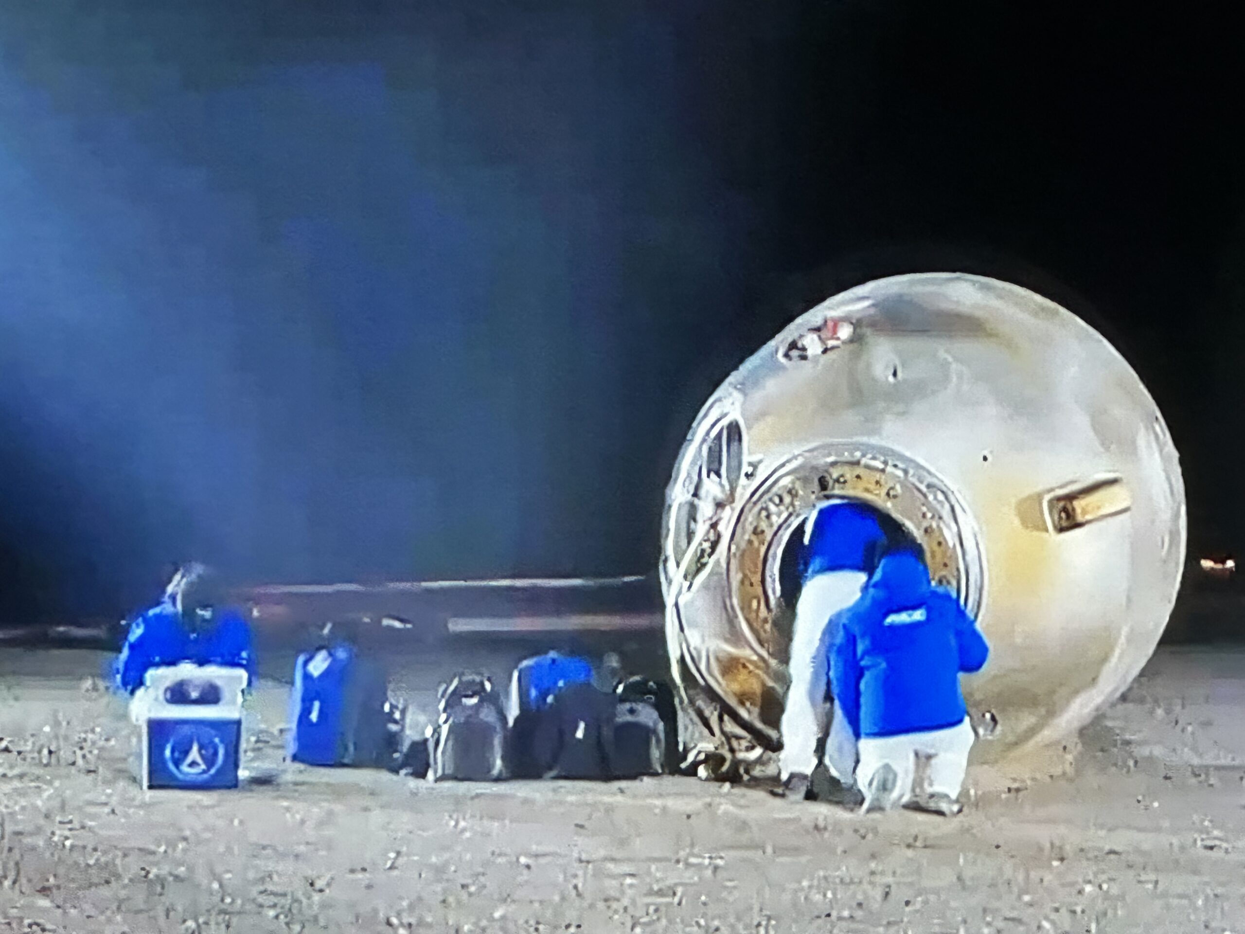 返回艙最終在晚上八時十分左右著陸,返回艙呈傾側狀態,外觀檢查正常,三名太空人報告感覺良好,搜救人員先為他們檢查身體,再將他們抬離返回艙。