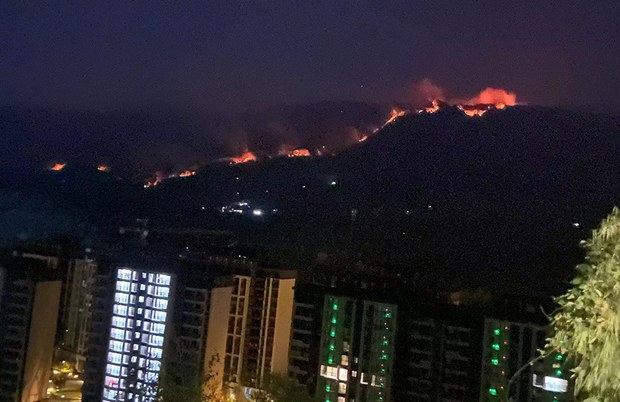 黑夜壟罩下濃煙四起,縉雲山的山脊在熊熊火焰中卻清晰可見,重慶北碚區歇馬街道縉雲山從8月21日晚間開始延燒的山火,截至目前仍在蔓延。