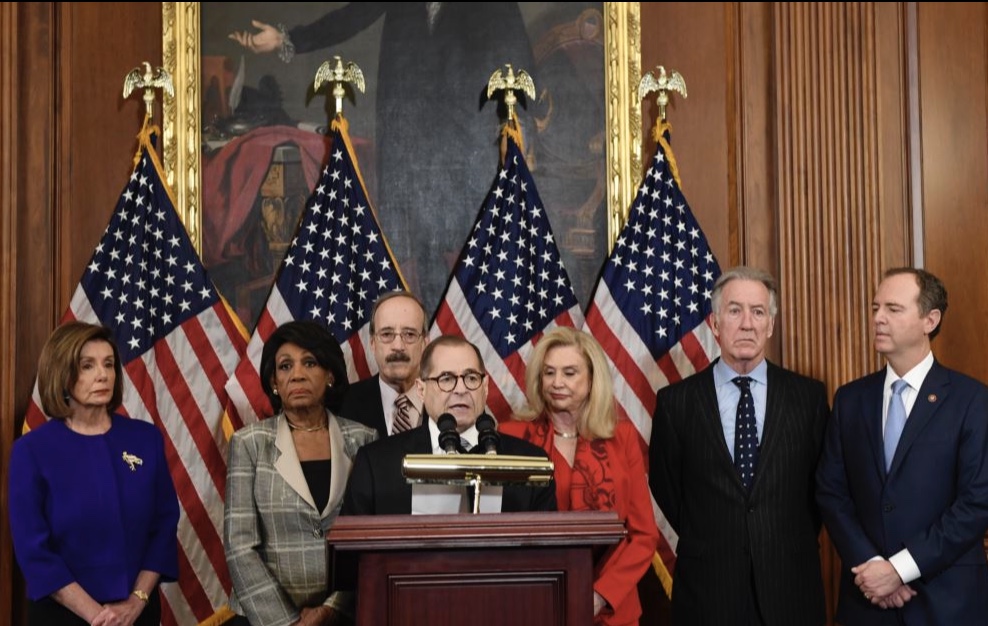 司法委员会主席纳德勒(Jerry Nadler)公布弹劾指控时说,特朗普“认为自己高于法律”。“我们必须清晰表示,没有人高于法律,即便是总统。”