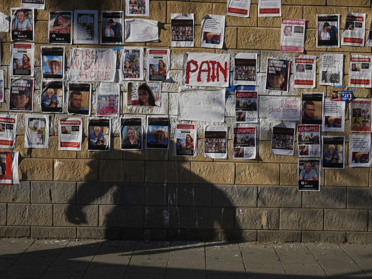 以色列特拉維夫一幅牆上貼滿被扣押在加沙的人質和失蹤者的相片。(美聯社)