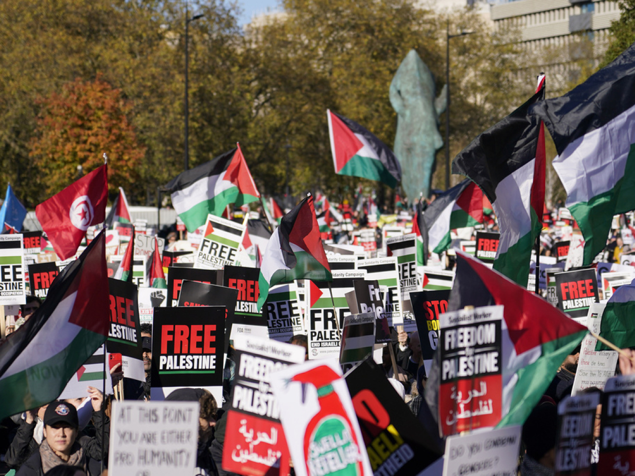 英國倫敦有支持巴勒斯坦人的遊行,要求以色列停止轟炸加沙。警方說,大約30萬人參與,是以色列與哈馬斯的戰事爆發以來,最大規模的一次,當局動員2000多名警員戒備。