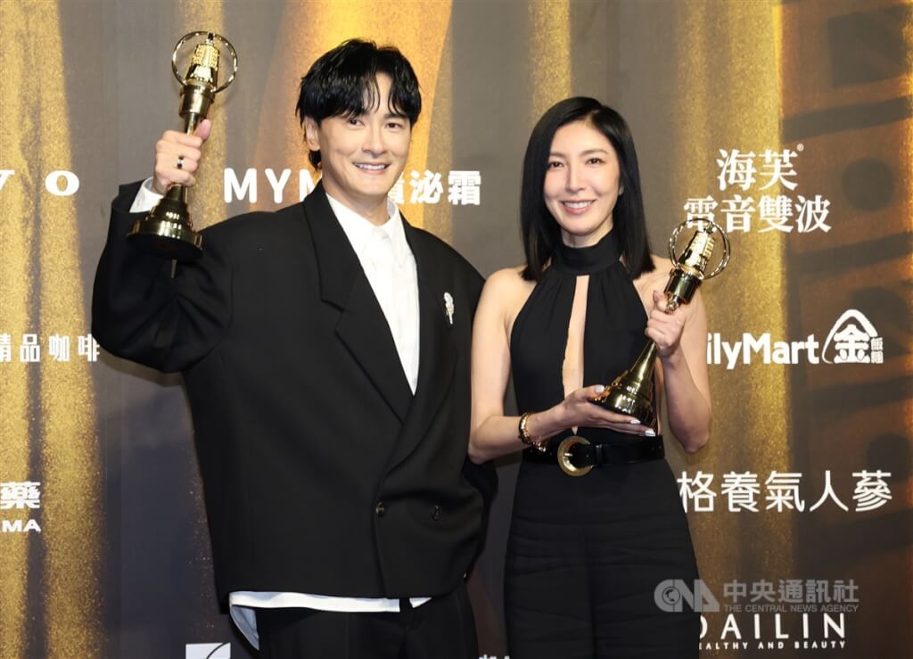 第59屆金鐘獎戲劇類頒獎典禮19日晚在台北流行音樂中心舉行,戲劇節目男、女配角獎分別由藝人鄭元暢(左)、楊謹華(右)獲獎,兩人開心合影留念。中央社記者張新偉攝
