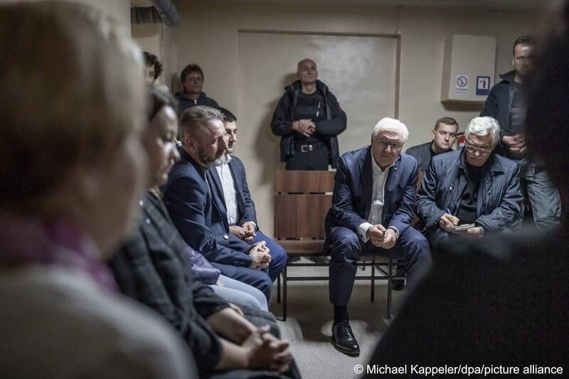東歐網媒《NEXTA》在推特PO出一張照片,可以看到德國總統史坦麥爾表情嚴肅地坐在木椅上,他周圍的人也都保持警戒,《NEXTA》在推文中表示「德國總統訪問烏克蘭期間,在防空洞待了一個半小時,當史坦麥爾與切爾尼戈夫(Chernihiv region)地區高利烏高夫卡(Koryukivka)鎮的居民交談時,防空警報響起了。