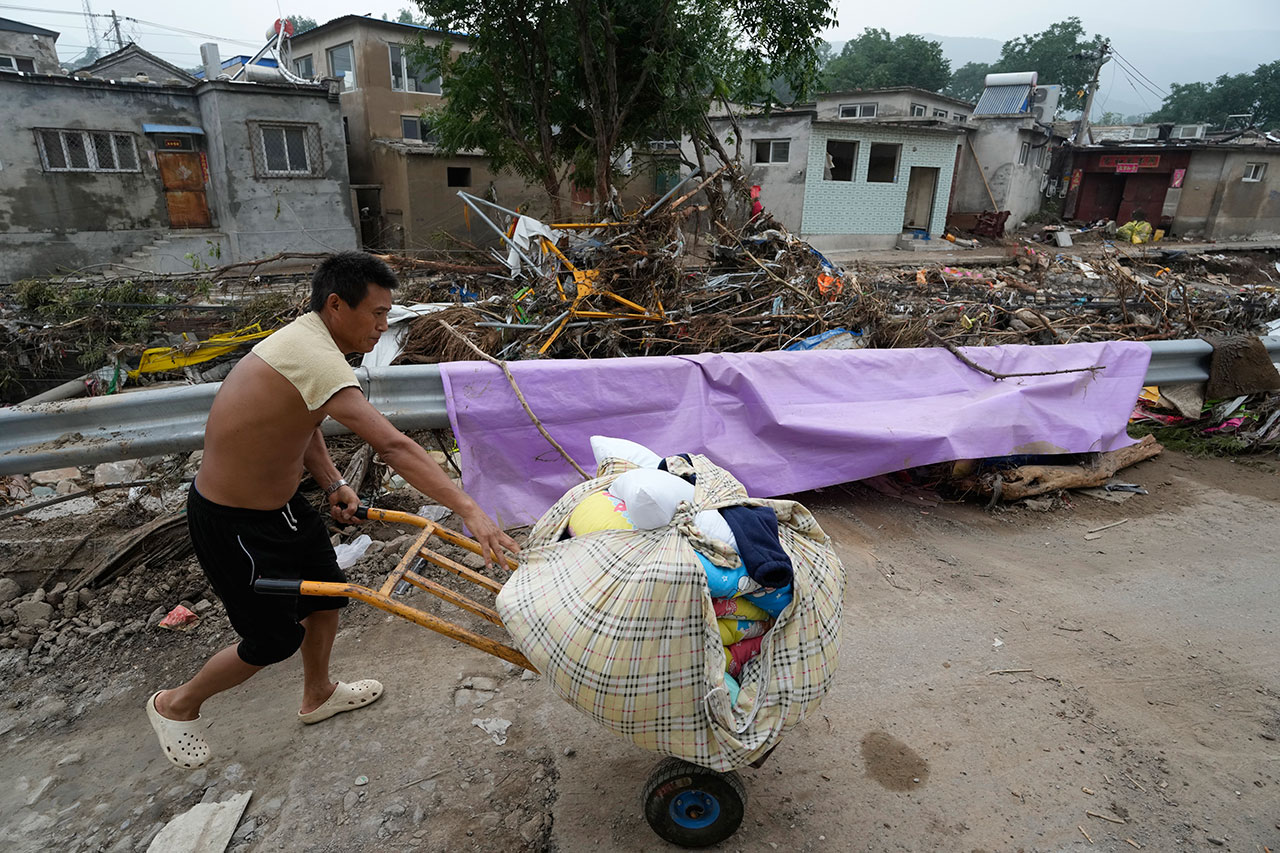 2023年8月4日,北京居民在洪災後的因房子無法居住,搬走他的物品。(美聯社)