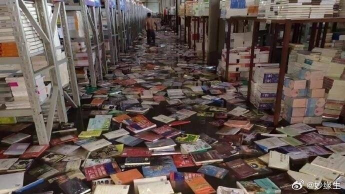 中國圖書銷售平台「中圖網」的倉庫受到洪災影響,導致400多萬冊圖書泡水報廢。(圖擷自微博)