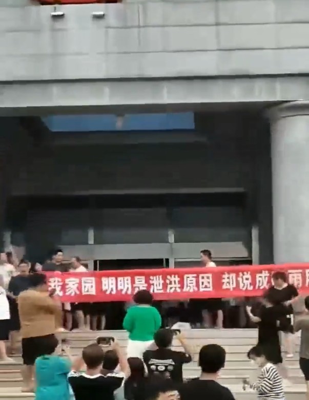 憤怒的當地村民4日前往政府大樓進行抗議,在現場高舉紅色橫幅布條:”還我家園,明明是洩洪原因,卻說降雨所致”。