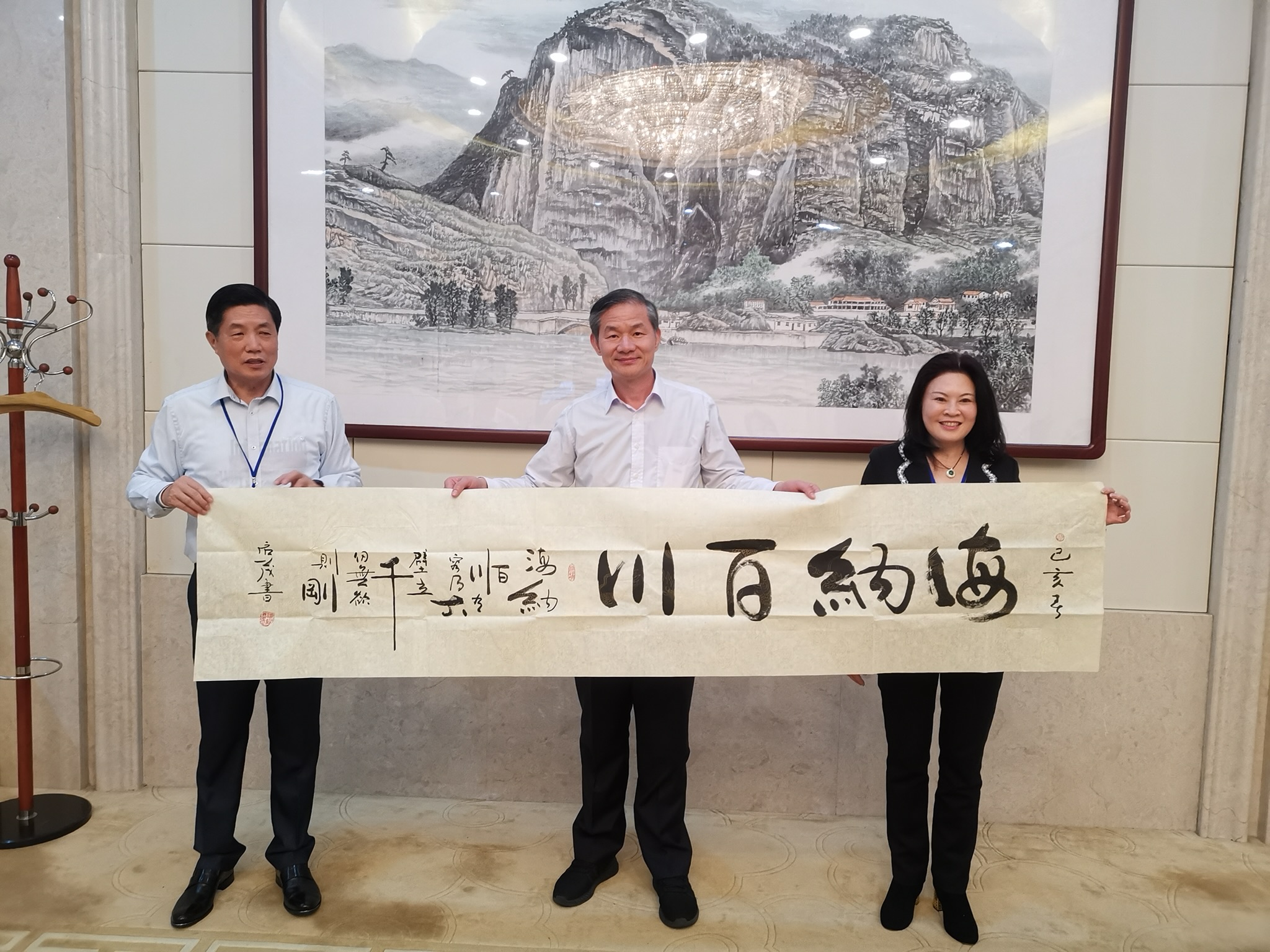 参访团团长江全孚(左)与萧玛娜(右)赠送书法给三明市委书记林兴禄(中)