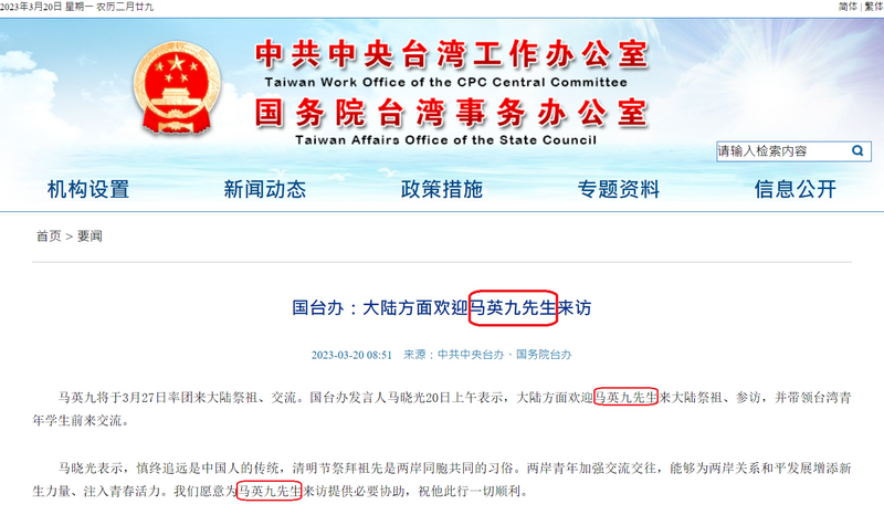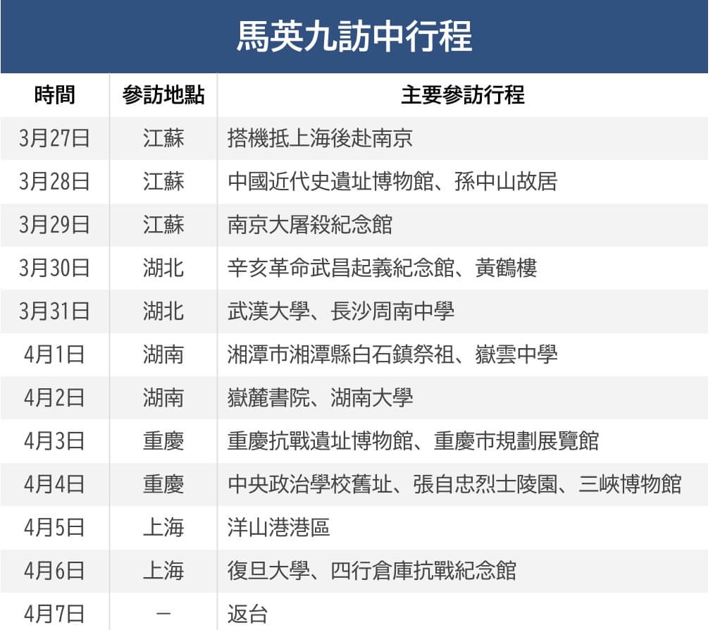 此外,馬英九在週二晚間於南京會與中共江蘇省委書記信長星會面和晚宴後,估計後續湖北、湖南、重慶和上海的省委書記,都會在當地與馬英九會面。而中共中央台辦、大陸國台辦主任宋濤,可能會在湖北武漢會見馬英九。