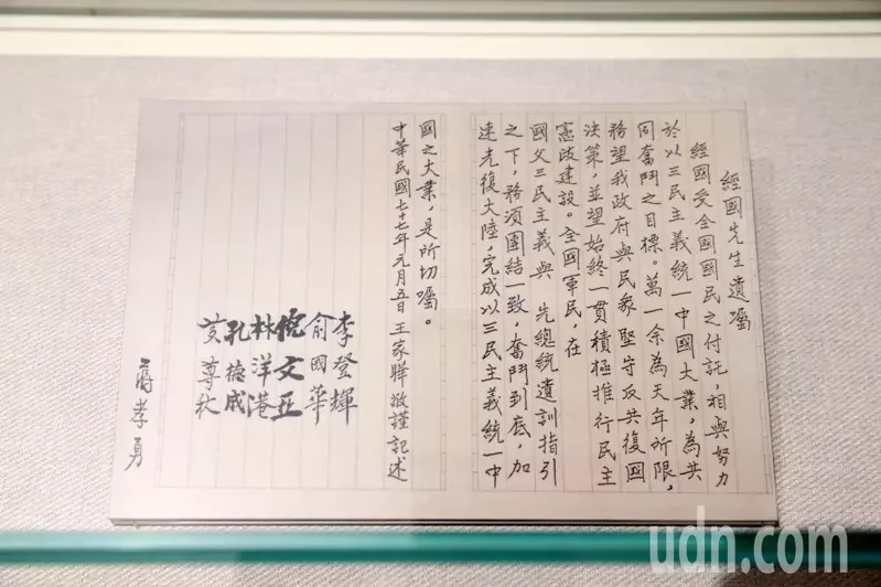 經國七海文化園區的蔣經國總統圖書館,一樓展示區展示的經國先生遺囑。記者邱德祥/攝影