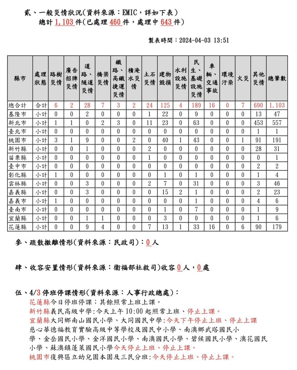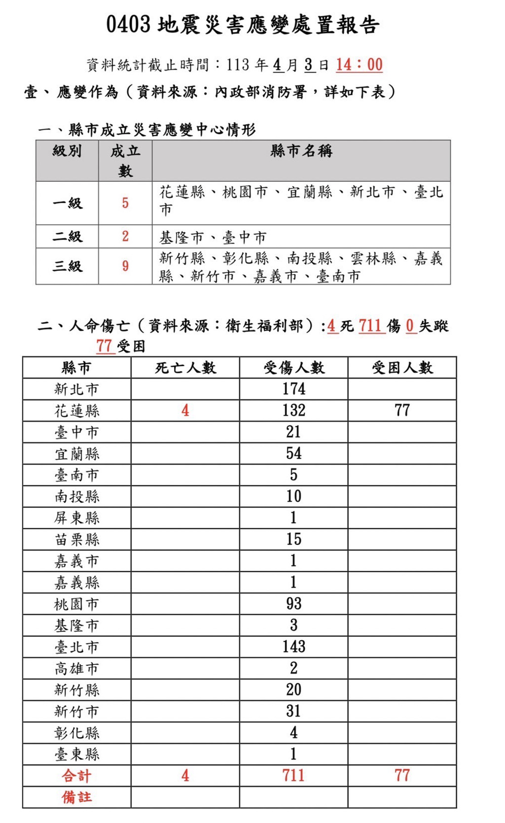 中央災害應變中心下午召開第14次工作會報,資料顯示,花蓮地震造成6人失聯、13人死亡、1140人受傷,另有38人留守在天祥地區。