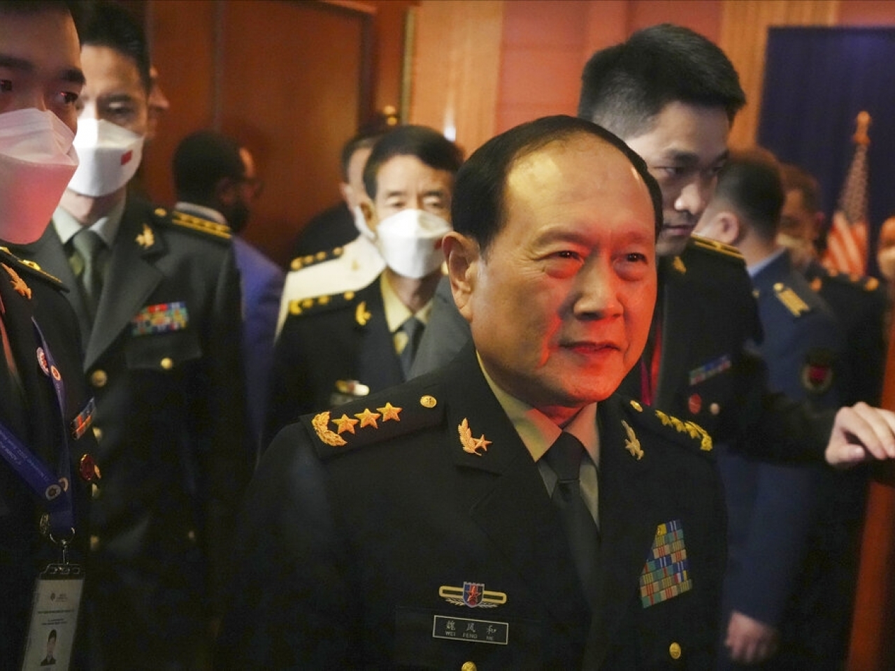 魏鳳和(圖)在柬埔寨與美國國防部長奧斯汀會談後離開現場。(美聯社)